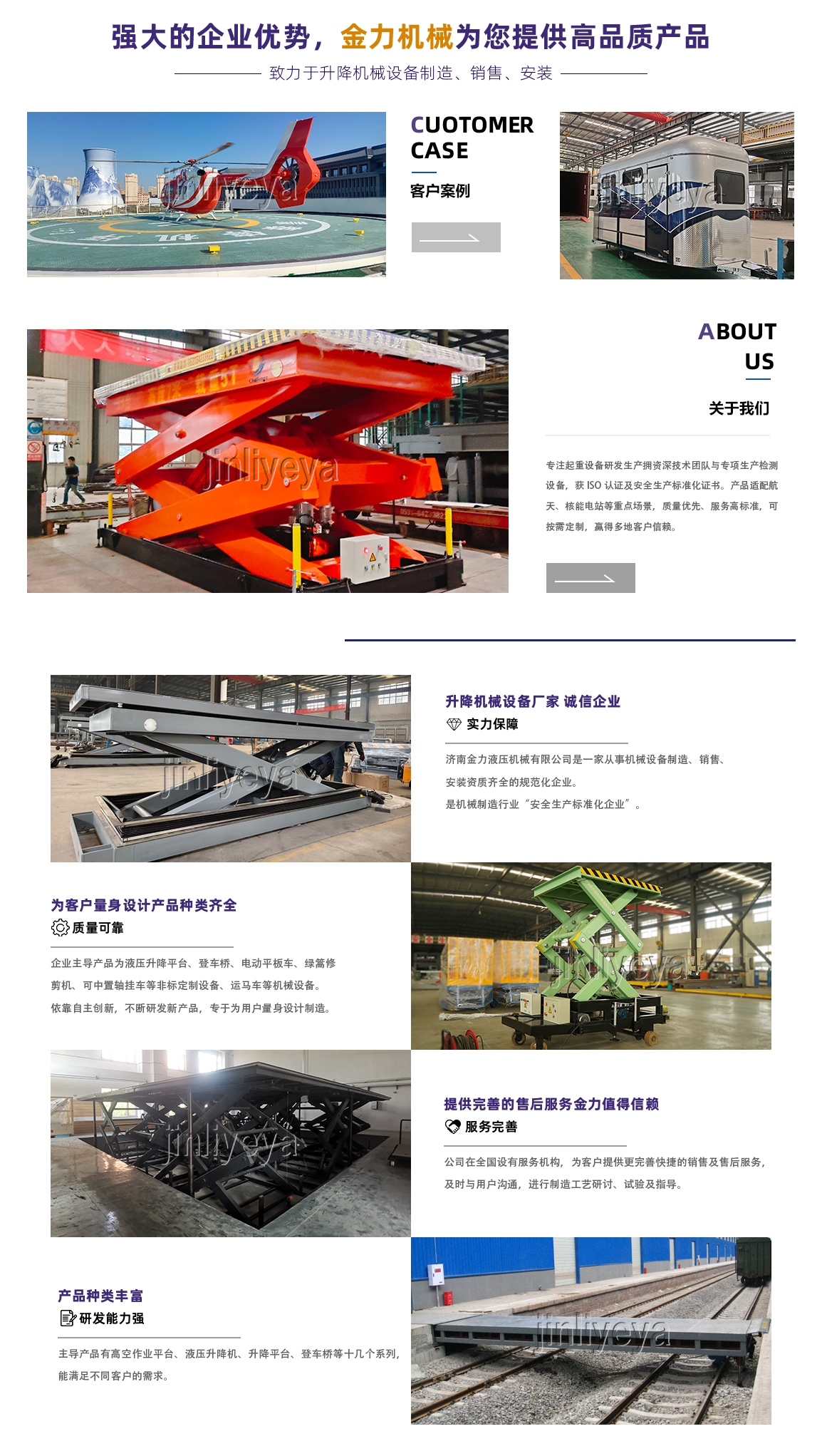 关于我们济南金力液压机械有限公司是质量、信誉双保单位,重合同守信用单位。于2004年改制,占地面积12万平方米,建筑面积8万平方米,本公司生产设备精良,检测手段齐全,技术力量丰富,是国内液压升降平台生产厂家。 本公司已通过了ISO国际质量管理体系认证,获得国家安全生产标准化证书。液压升降平台生产设备精良,检测工具齐全,具有较强生产能力,不断研发新产品,坚持诚信为本 、信誉至上的信念和优zhi的服务标准赢得了广大用户的信赖,连续给中国航天科技集团、航空工业、航星设计院、机场、电厂等国家重点单位做配套设备。 公司重视知识产权的保护和自主创新,不断提高研发能力。申报国家发明zhuanli四项:电动旋转垂直升降式立体车库、一种操作面积可变的升降平台、一种抗爆容器支撑调节平台、一种挂车;实用技术zhuanli若干项包括:车载式绿篱修剪机、快速伸缩式铁路跨桥、升降平台安全稳定装置、低压轨道供电电动平车、双速电机电动平车、机车分离式快速...